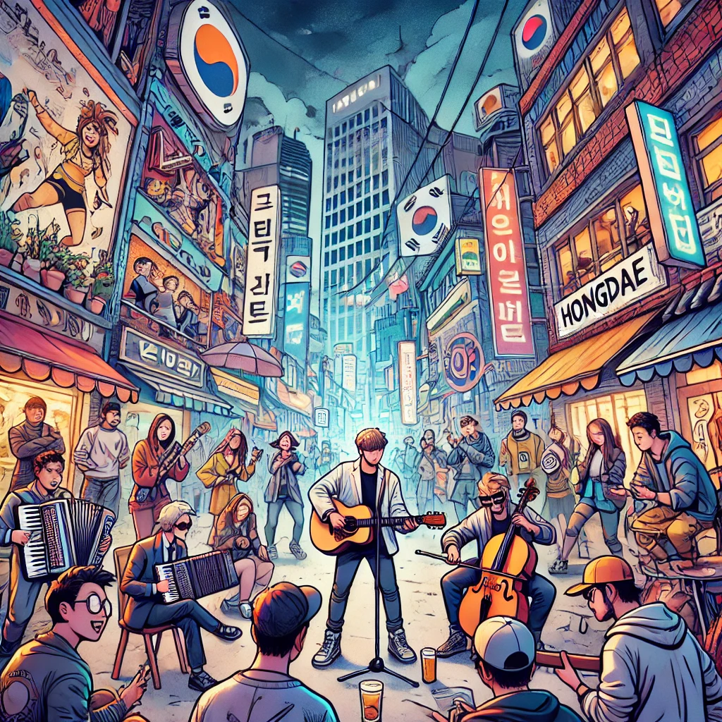 One of the highlights of Hongdae (홍대) is its live music scene. Many aspiring musicians perform on the streets, showcasing a wide range of genres from indie rock to K-pop covers. These street performances usually take place in the evening, creating a lively and energetic atmosphere. Additionally, there are several live music venues and clubs where you can catch performances by local bands.